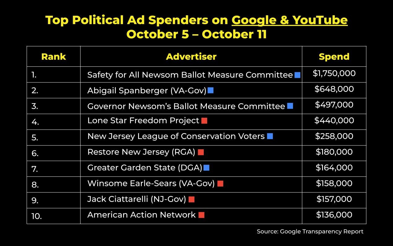 We’re less than 3 weeks out from Election Day and it’s not surprising to see the DGA and RGA’s significant investments in New Jersey, as well as both Virginia gubernatorial candidates on this list.