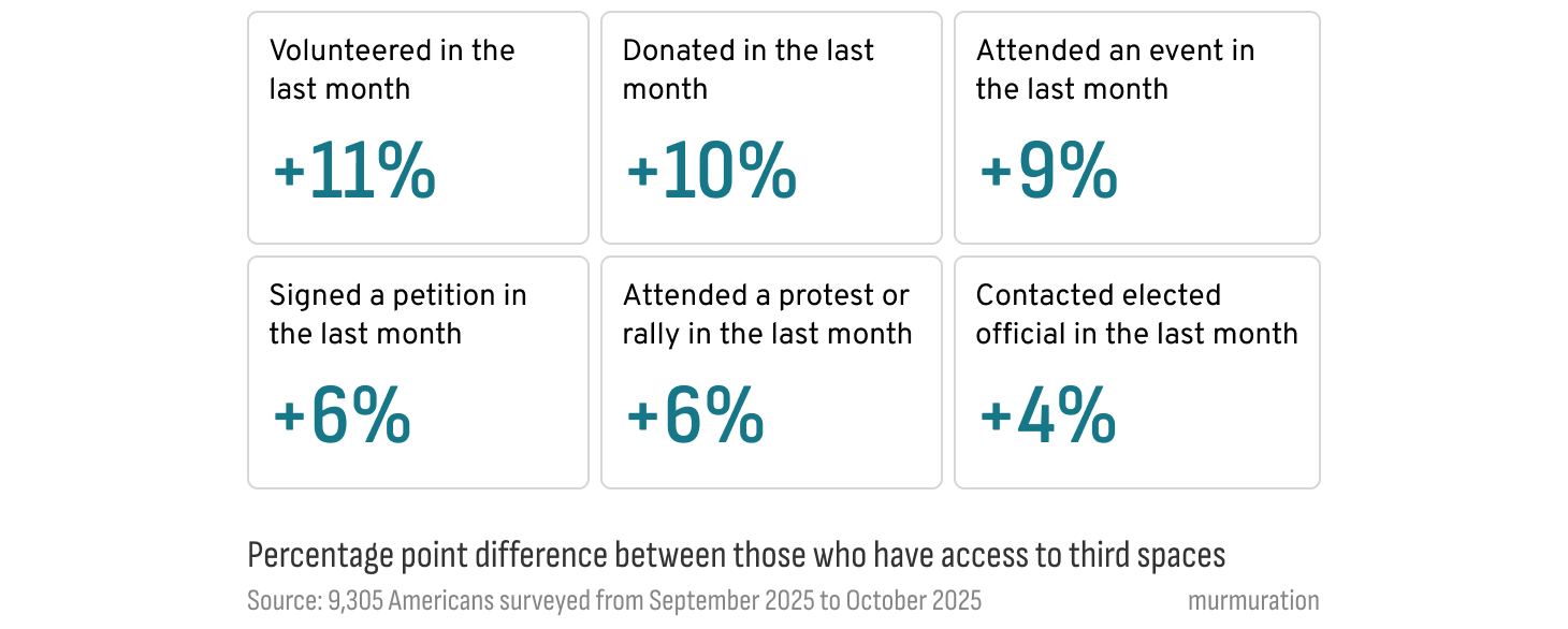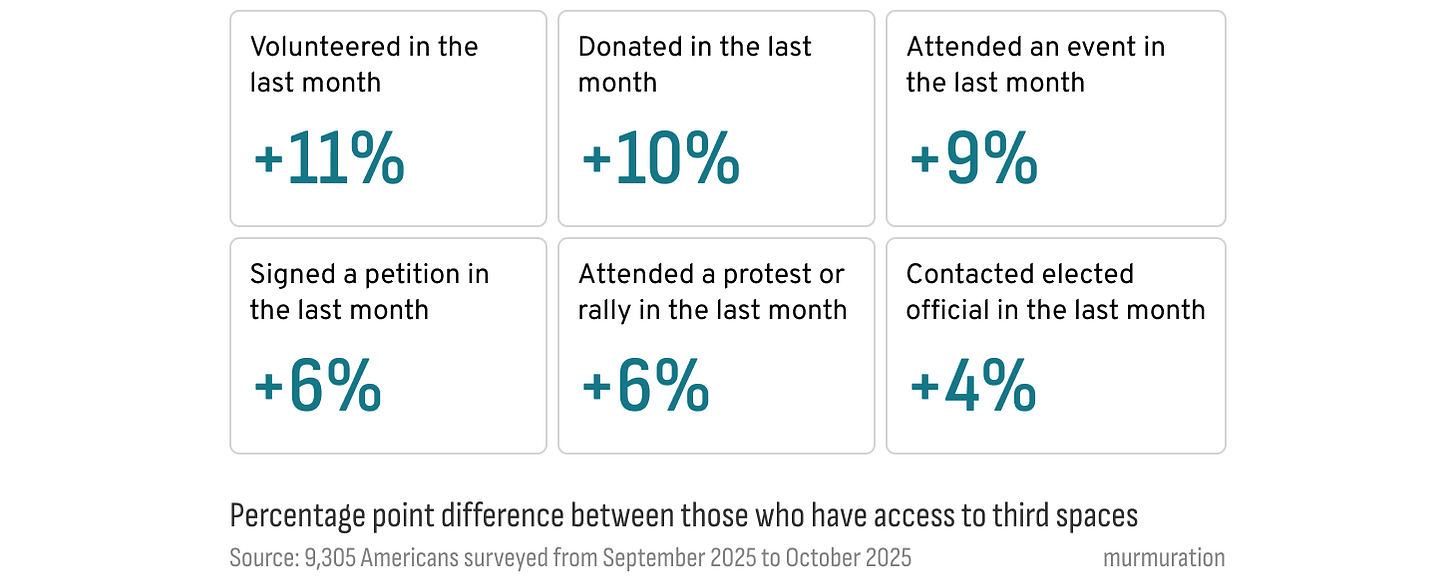 But what’s most striking is that the absence of third spaces doesn’t just affect how people feel, it changes how they act. Even after accounting for partisanship, income, education, geography, and broader national mood, access to third places remains one of the strongest predictors of civic participation. People without them are less likely to say they always vote in local elections (-7pp) or have participated in civic life in the past month (-20pp).