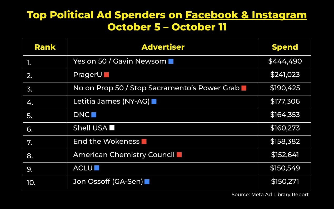 FWIW, U.S. political advertisers spent about $11.4 million on Facebook and Instagram ads last week. Here were the top ten spenders nationwide: