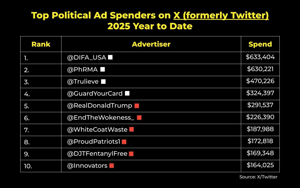 On X (formerly Twitter), political advertisers in the U.S. have spent around $8.8 million on ads in 2025. According to X’s political ad disclosure, here are the top spenders year to date: