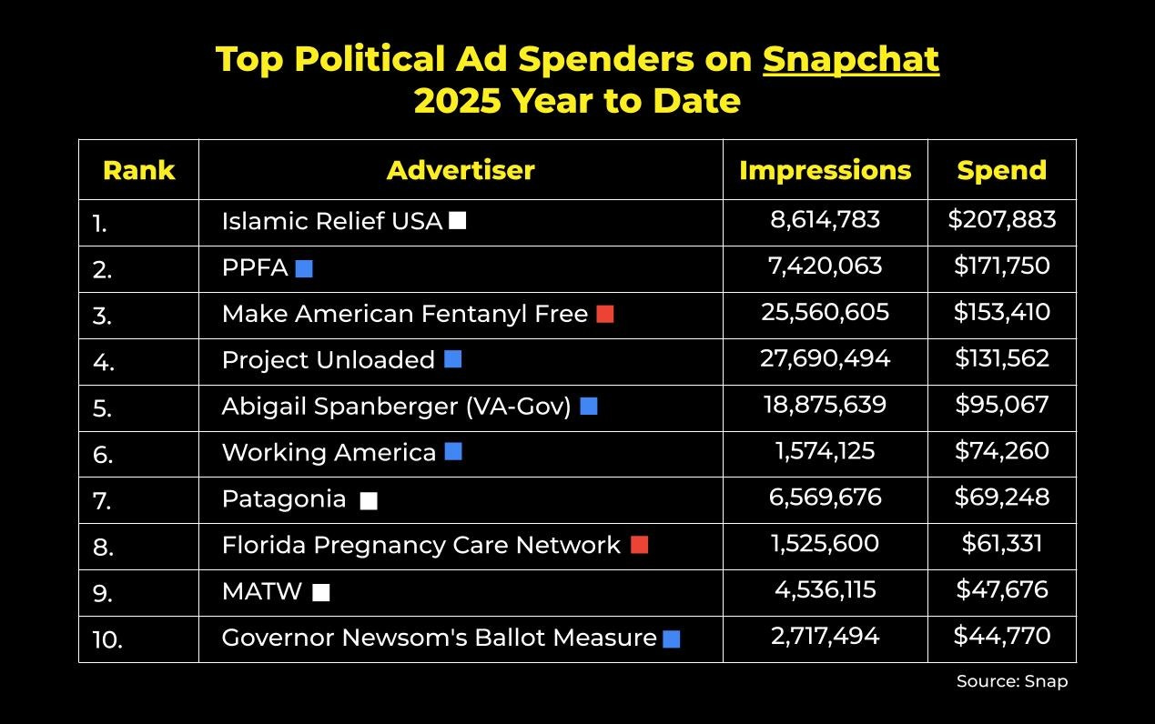 And lastly, on Snapchat, political advertisers in the U.S. have spent around $1.8 million on ads in 2025. Here are the top spenders year to date: