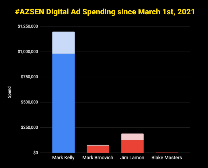 Arizona: After winning his election in 2020 by a narrow margin, Senator Mark Kelly never stopped campaigning. Unfortunately already up for re-election next year, his campaign operation knows what they have to do to maintain momentum and win again in the midterms. Here’s what Facebook + Google ad spending looks like in that race: