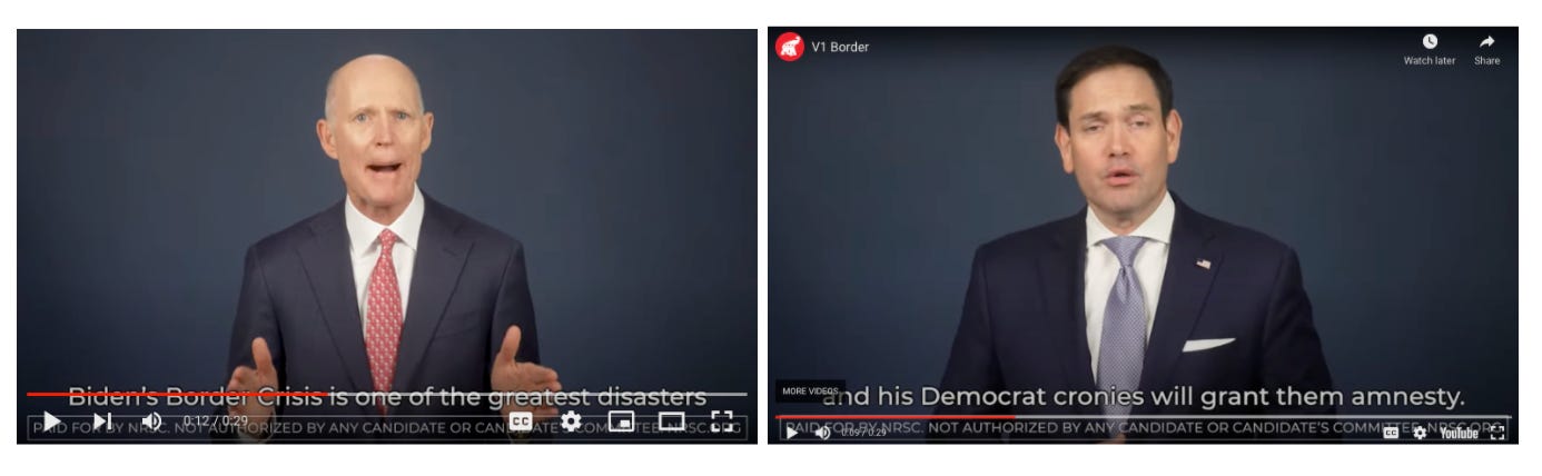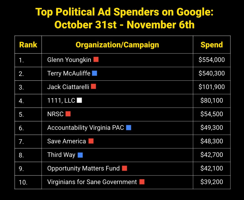 The majority of last week’s Google/YouTube spending reflects the final days of the 2021 elections in Virginia and New Jersey. However, we saw the NRSC launched a new wave of nationwide YouTube ads hammering the issue of immigration - talking up “Biden’s border crisis” and falsely stating that “millions of illegal immigrants are flooding into America.”