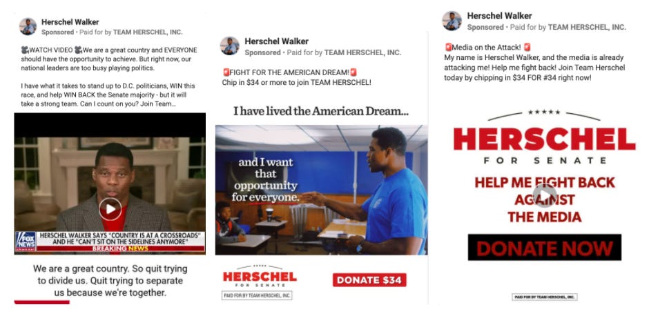 As far as we’ve seen, Walker’s ads have been exclusively for fundraising, highlighting a “red wave” coming and sharing his support for the “American Dream.”