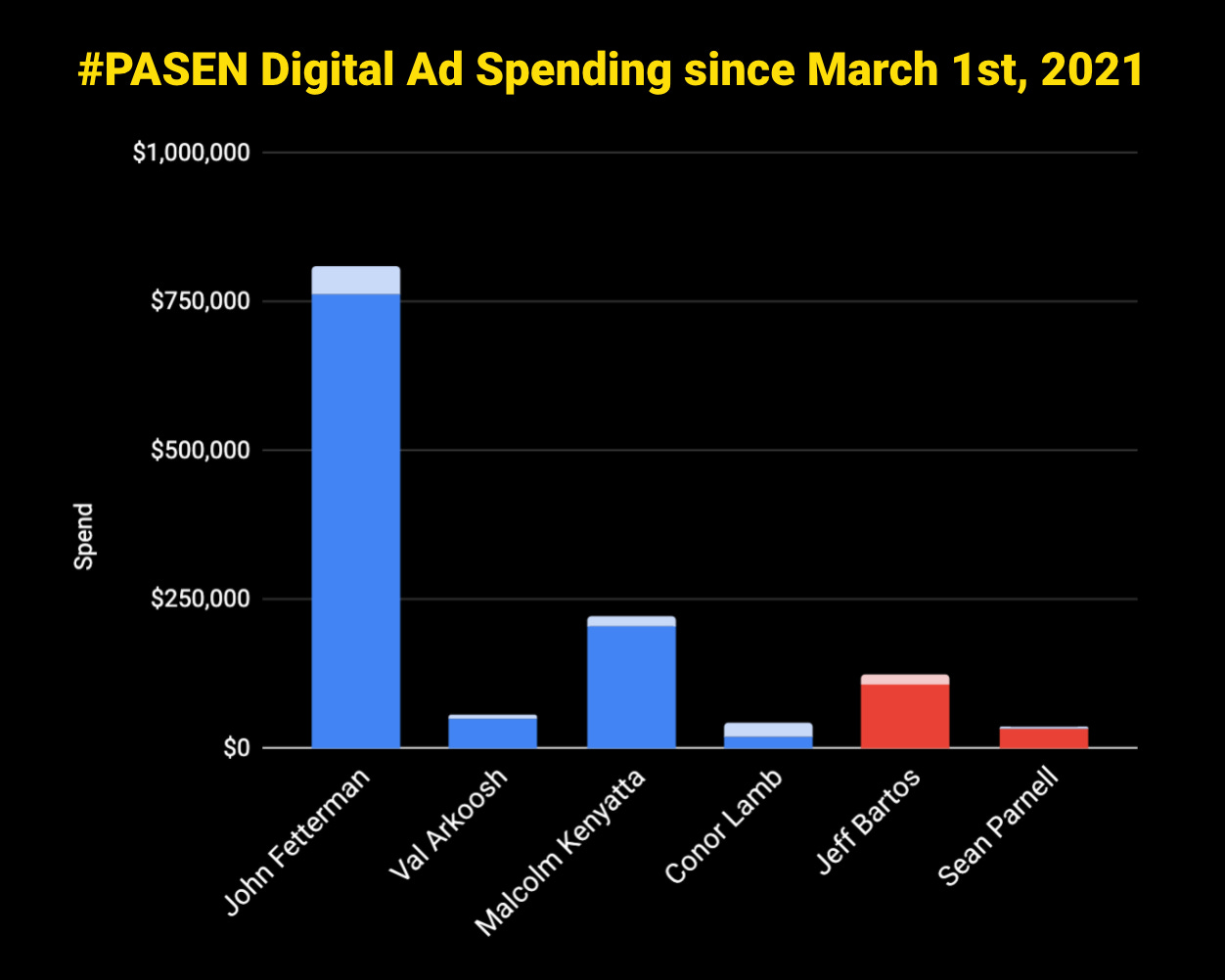 Pennsylvania: Since March, Lt. Governor John Fetterman has been one of the top candidate ad spenders nationwide on Facebook. He’s swamped his rivals on both sides of the aisle in online spending, in hopes of consolidating grassroots Dem dollars ahead of a competitive Democratic primary. Here’s how much candidates for U.S. Senate in PA have spent on Facebook and Google advertising since March:
