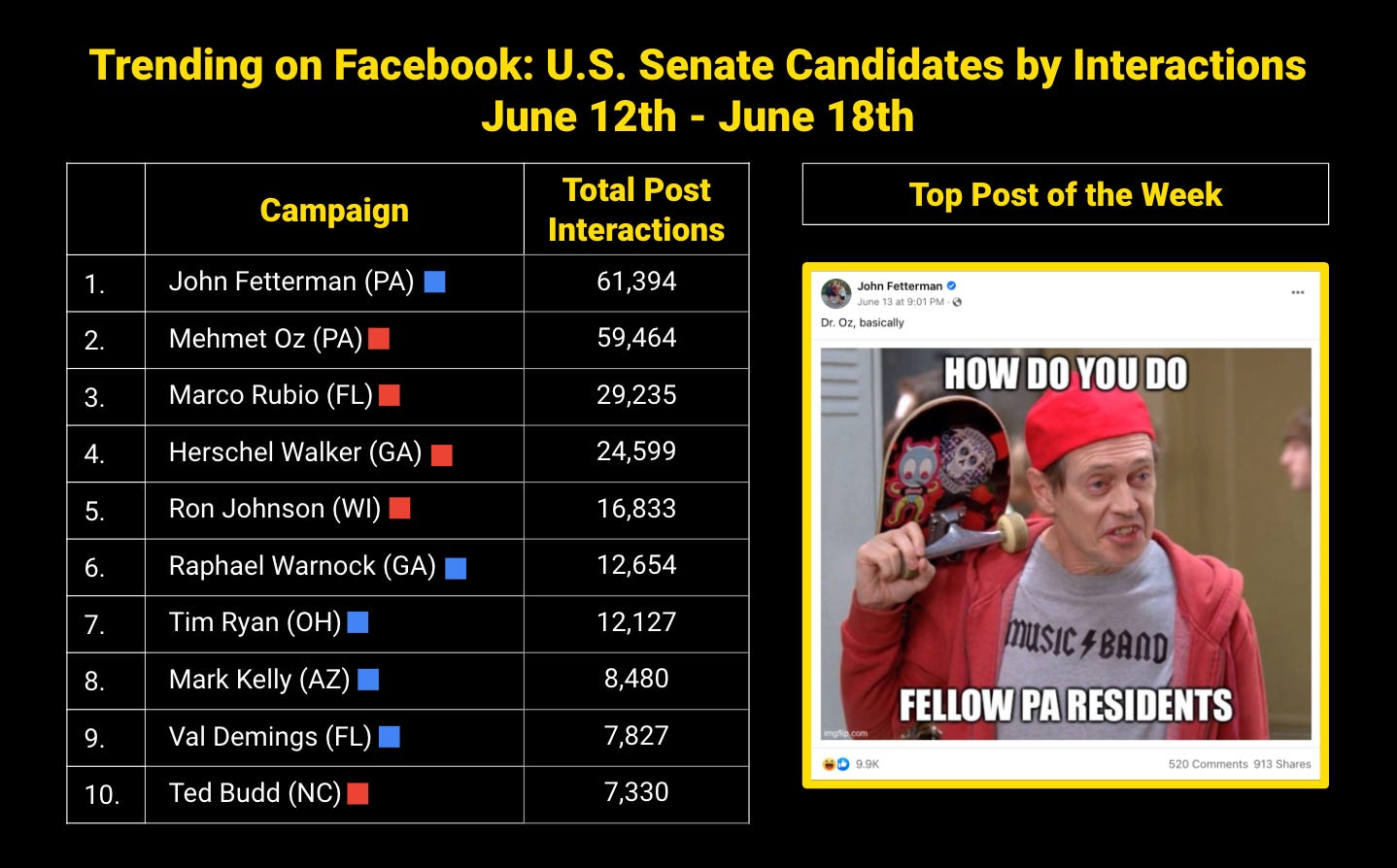 Pennsylvania candidates John Fetterman and Dr. Oz led the field in terms of total post engagement, and Fetterman scored the top-performing Facebook post among Senate candidates last week, with a meme slamming Oz. We’ve got much more on Fetterman’s Facebook skills below.