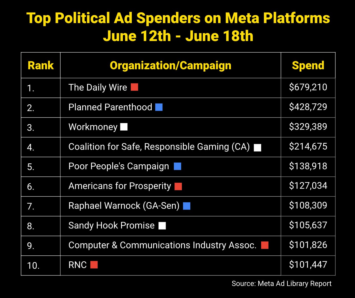 FWIW, here were the top-spending political advertisers on Facebook + Instagram last week: