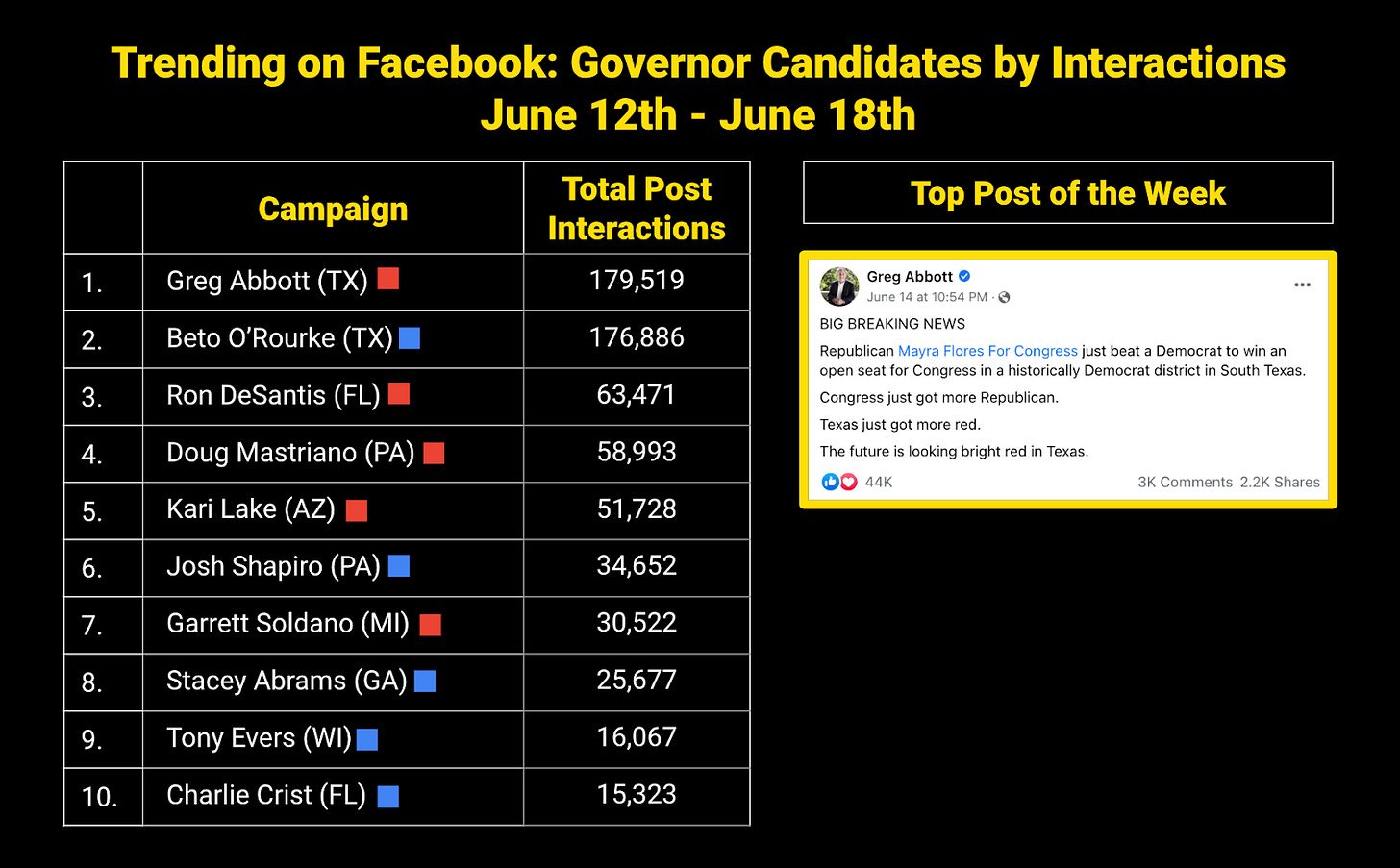 On the Gov. side, Texans Greg Abbott and Beto O’Rourke were neck and neck with Facebook interactions, far-outpacing all other campaigns. The top-performing post came from the Abbott camp, celebrating Republicans’ special election win last week.