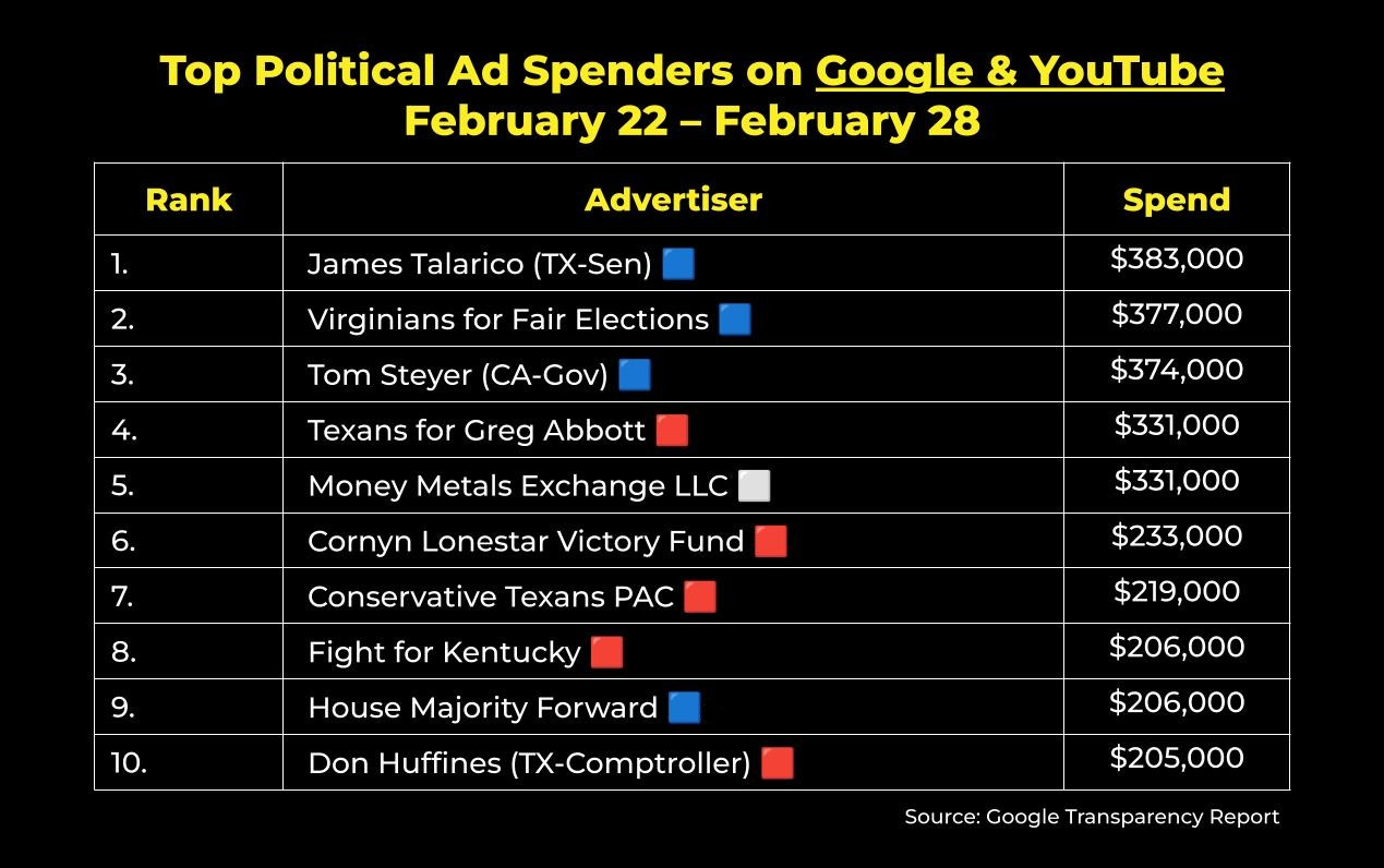 Texas’ primary election was March 3rd and this data reflects the last full week before E-Day. Still, it’s pretty wild that half of this list is made up of Texan entities. Of the $9.1M spent on Google and YouTube last week, about 1/3 of it was on ads shown in Texas alone.