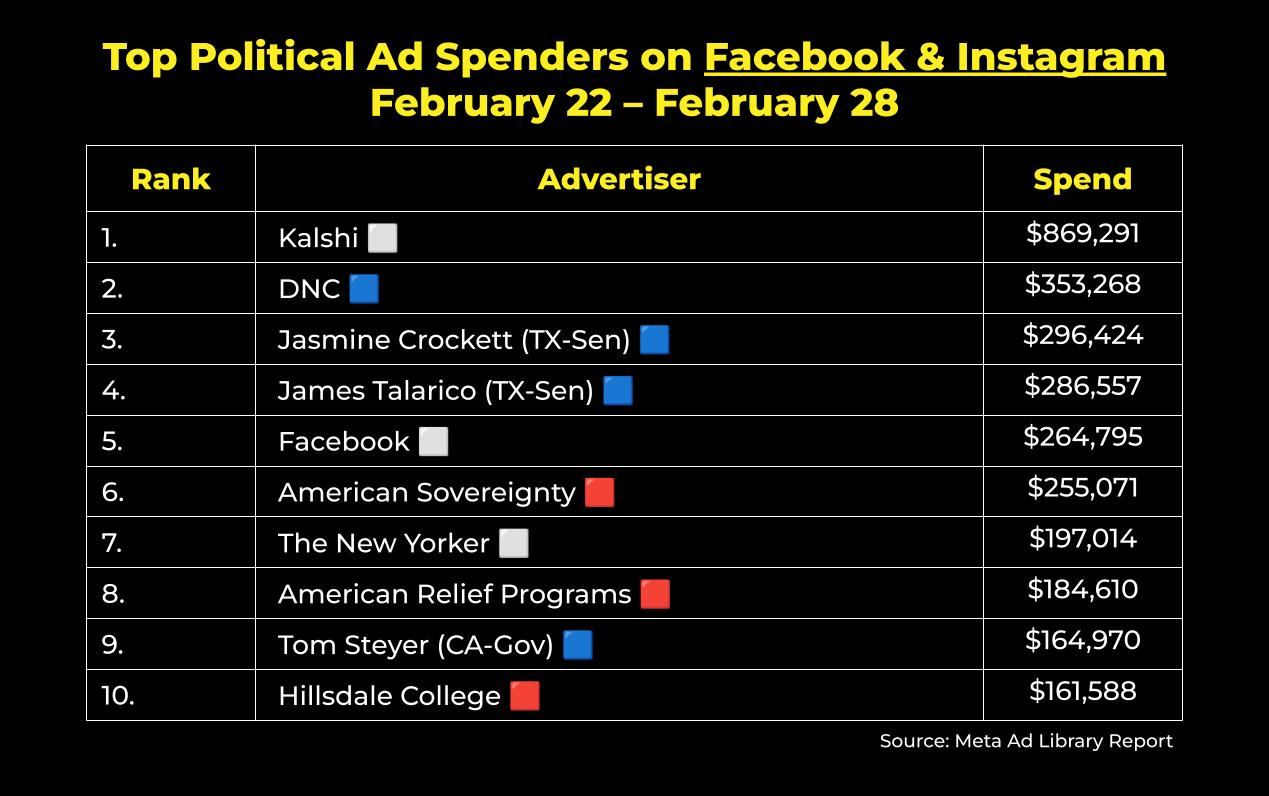 Unsurprisingly, Texas Democratic Senate primary opponents Jasmine Crockett and James Talarico took 2 of the top 5 spots on this list, both investing nearly $300K each on Meta platforms the week before Election Day. As we now know, Talarico would go on to ultimately secure the nomination. It’s unclear who his opponent will be in November’s general election because Republicans are in disarray and 4-term incumbent Sen. John Cornyn is headed to a runoff against Texas Attorney General Ken Paxton on May 26th.