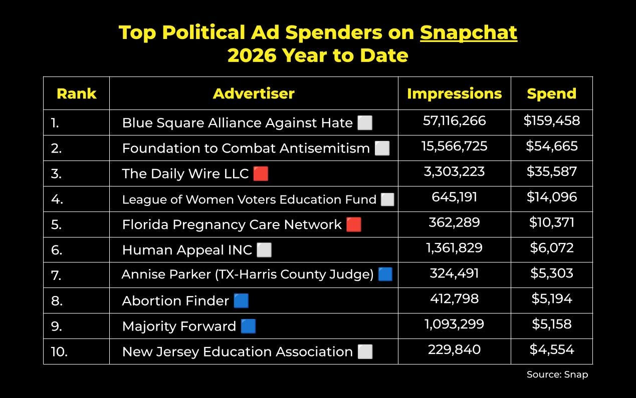 …and lastly, on Snapchat, political advertisers in the U.S. have spent just under $345,000 on ads in 2026. Here are the top spenders year to date: