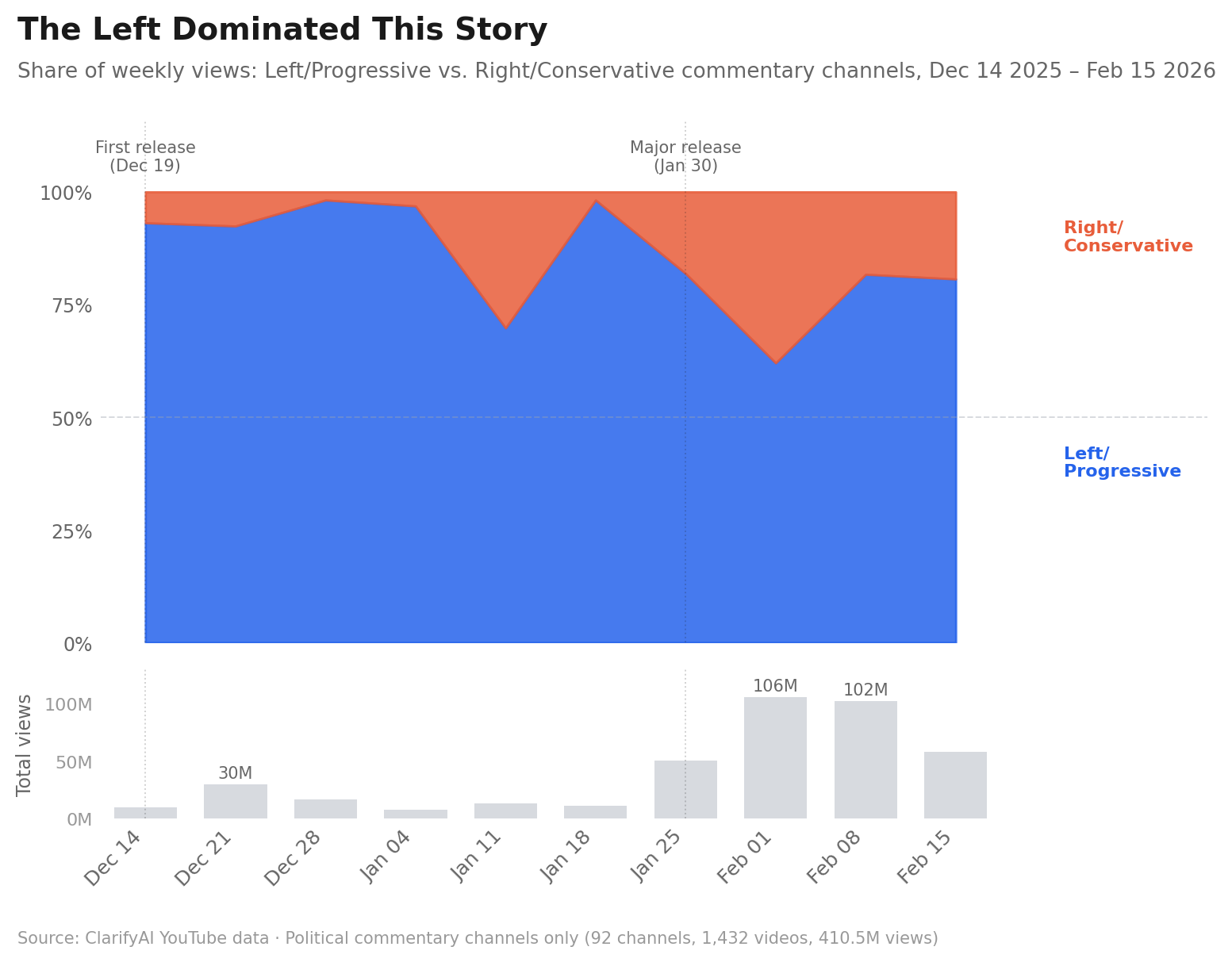 Then everything changed when the first batch of Epstein files was released on December 19. That week, progressive content drove 9.3 million views while right-wing content drove only 700,000 — a 13:1 ratio. By December 28, the gap widened to 54:1.