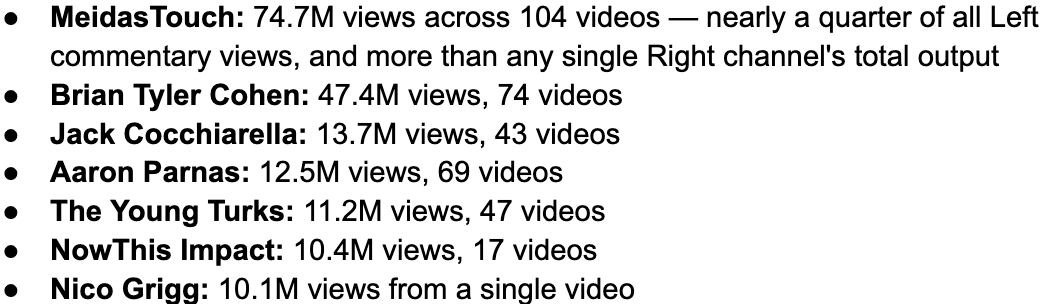 For at least the last decade, digital strategists have been sounding the alarm about how YouTube plays a central role in alt-right pipelines. After the 2024 election, reporting emphasized how the right dominates the most-viewed online news accounts and how the algorithm favors right-wing content.