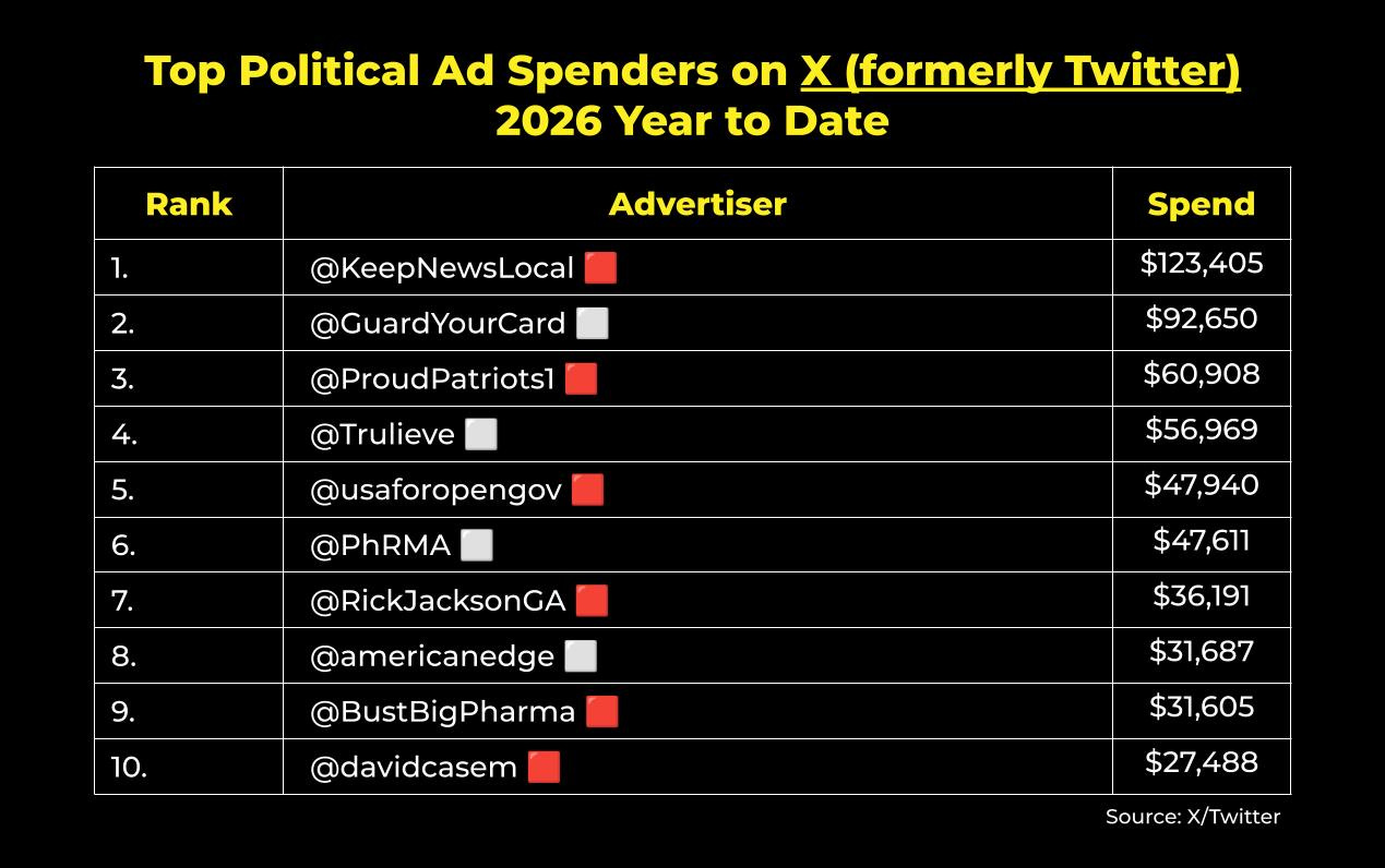 On X (formerly Twitter), political advertisers in the U.S. have spent $1.3M on ads so far in 2026. According to X’s political ad disclosure, here are the top spenders year to date: