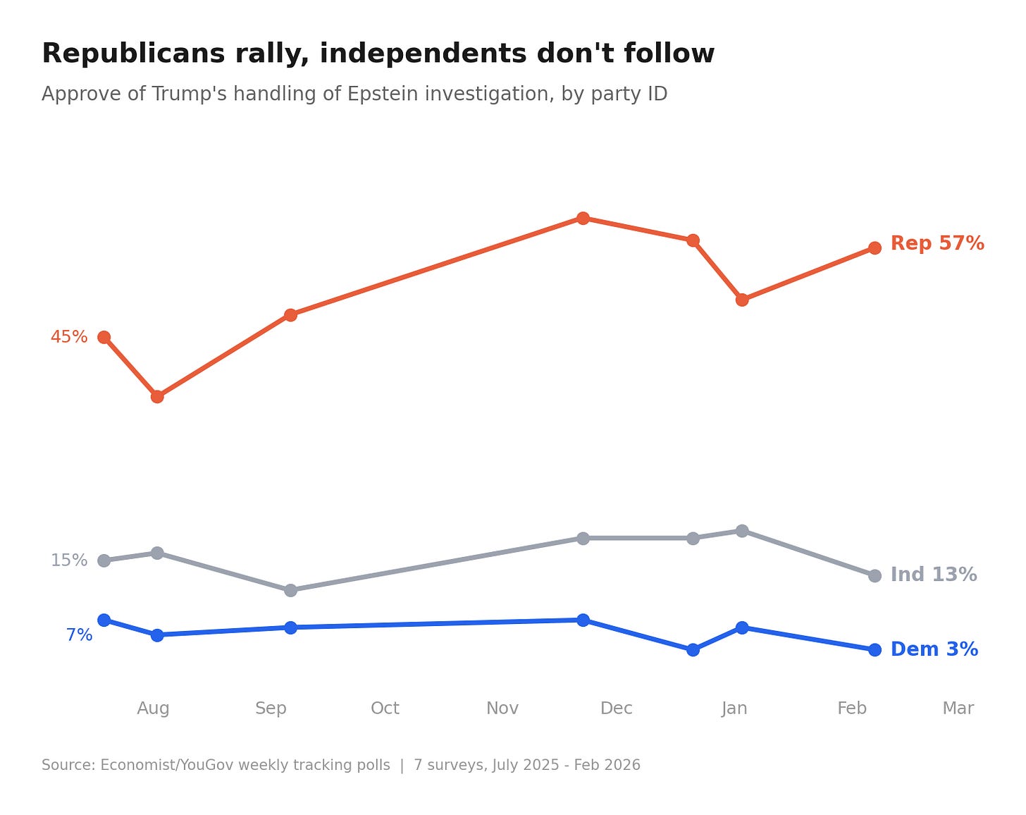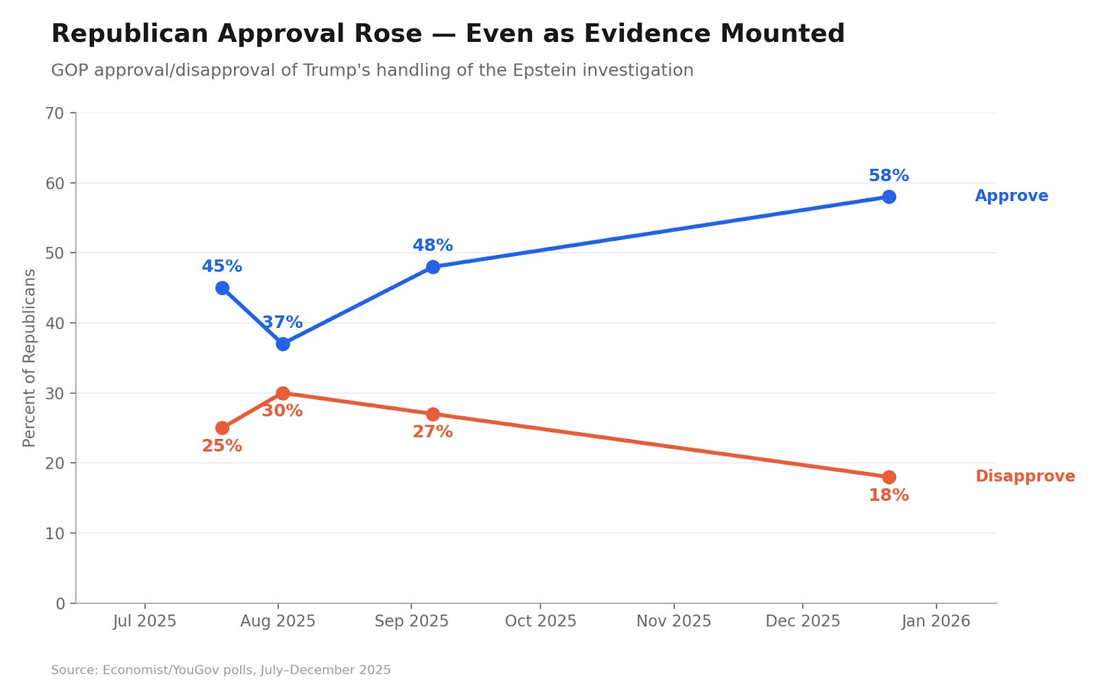 Between July and December 2025, Republican approval of Trump’s handling of the Epstein investigation rose from 45% to 58%, according to Economist/YouGov polling. During that period, the administration released very little information, missed its congressional deadline, and the documents that did emerge contained potentially damaging Trump connections.