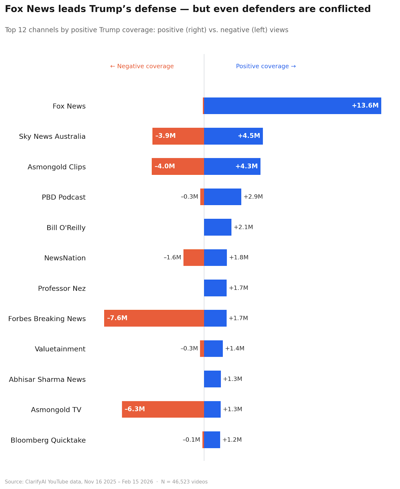 Entertainment voices are a wildcard. Gaming streamer Asmongold, for example, drove 8.3 million positive views on Trump and Epstein. In this video with 1.5 million views, he suggests Trump acted as a “whistleblower” to help convict Epstein. Entertainment channels that dip into political content can move meaningful numbers — they’re not the core defense infrastructure, but they matter at the margins.