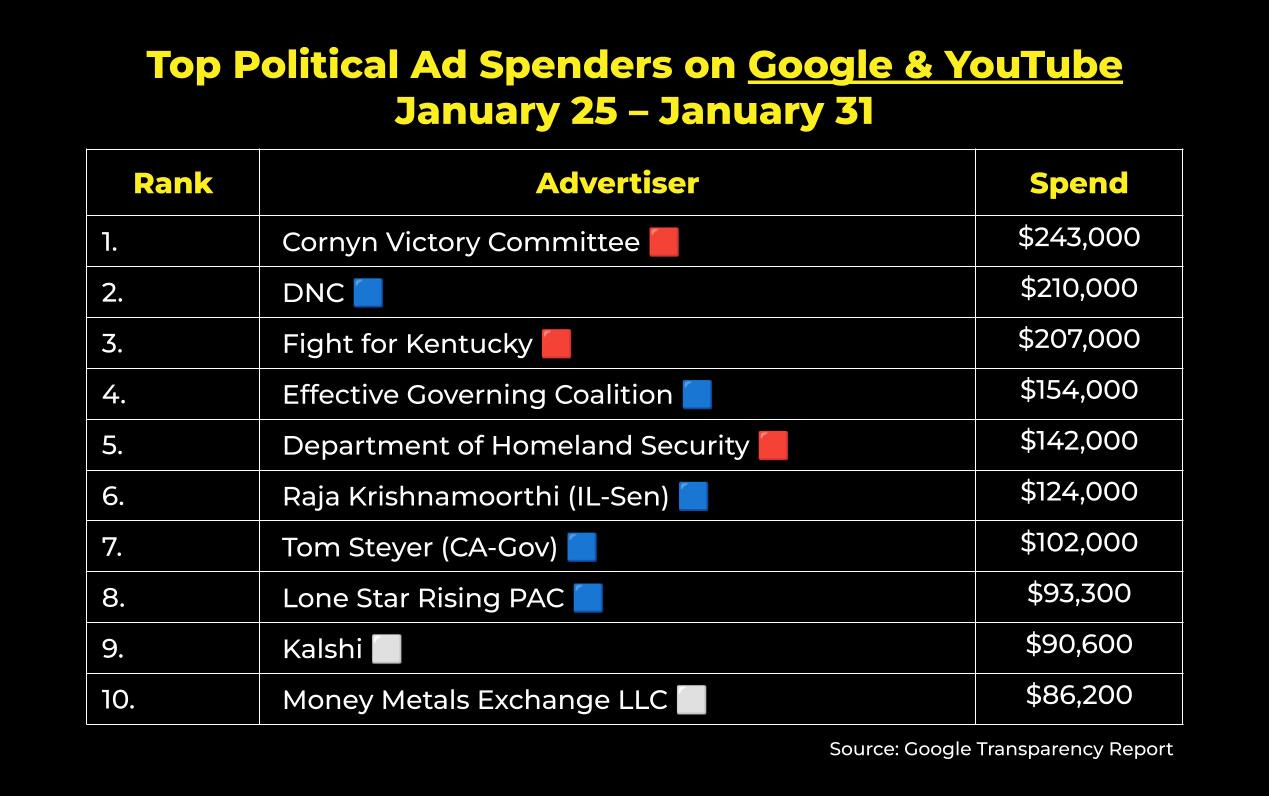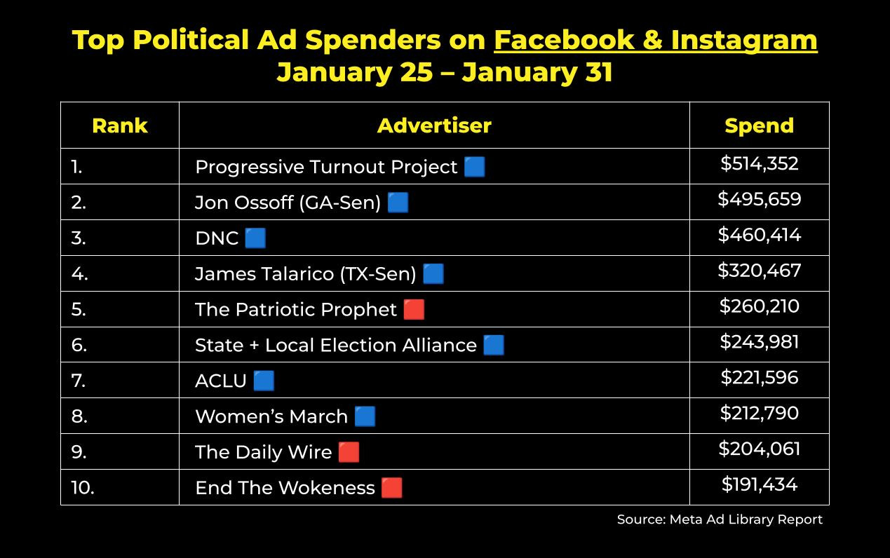 Meta platforms were dominated by left-leaning ad spend last week, most notably with James Talarico and Jon Ossoff’s Senate campaigns combining for over $800K. After a testy week in Texas Senate Primaryland, Talarico’s ads touted him as “Democrats’ best chance to flip Texas’ Senate seat,” while Ossoff’s looked ahead to the general election, highlighting the fact that Republicans have already spent $10M against him in Georgia.