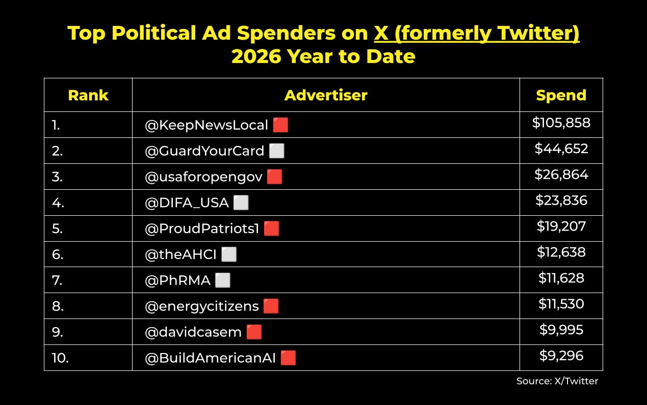 On X (formerly Twitter), political advertisers in the U.S. have spent $478,944 on ads so far in 2026. According to X’s political ad disclosure, here are the top spenders year to date on the platform where Democratic ad spend continues to dwindle: