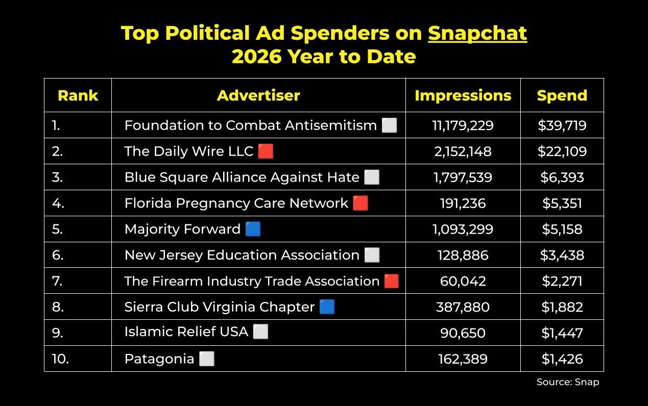 …and lastly, on Snapchat, political advertisers in the U.S. have spent $99,295 on ads in 2026. Here are the top spenders year to date: