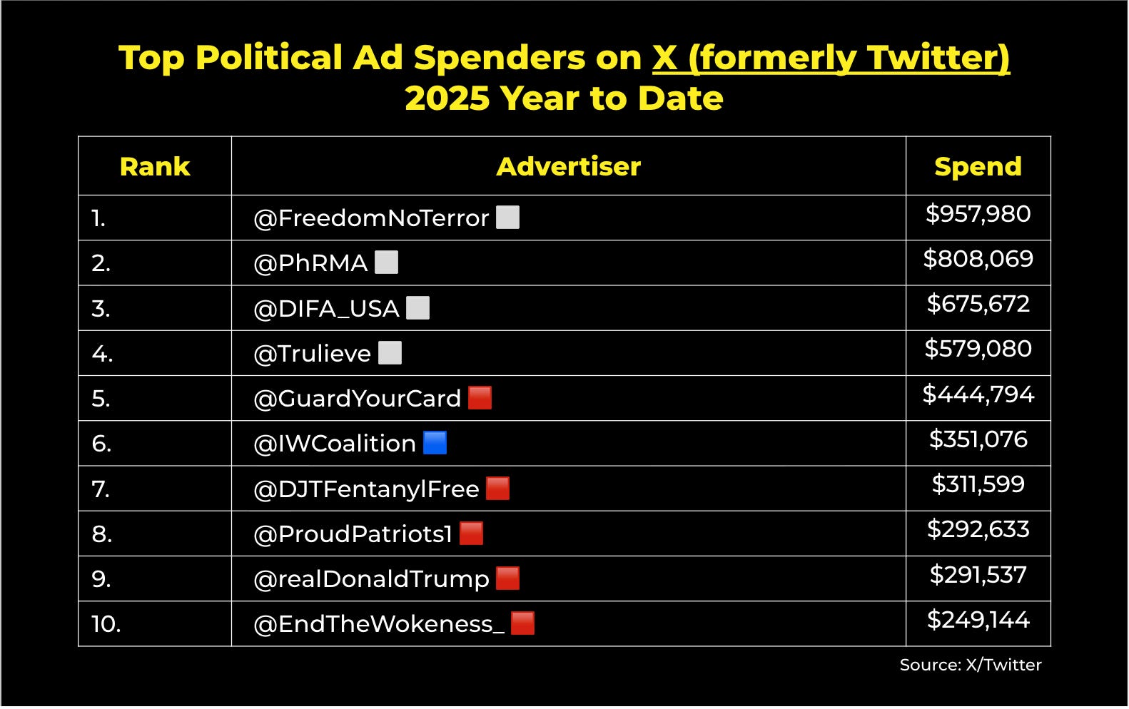 On X (formerly Twitter), political advertisers in the U.S. have spent around $12 million on ads in 2025. According to X’s political ad disclosure, here are the top spenders year to date:
