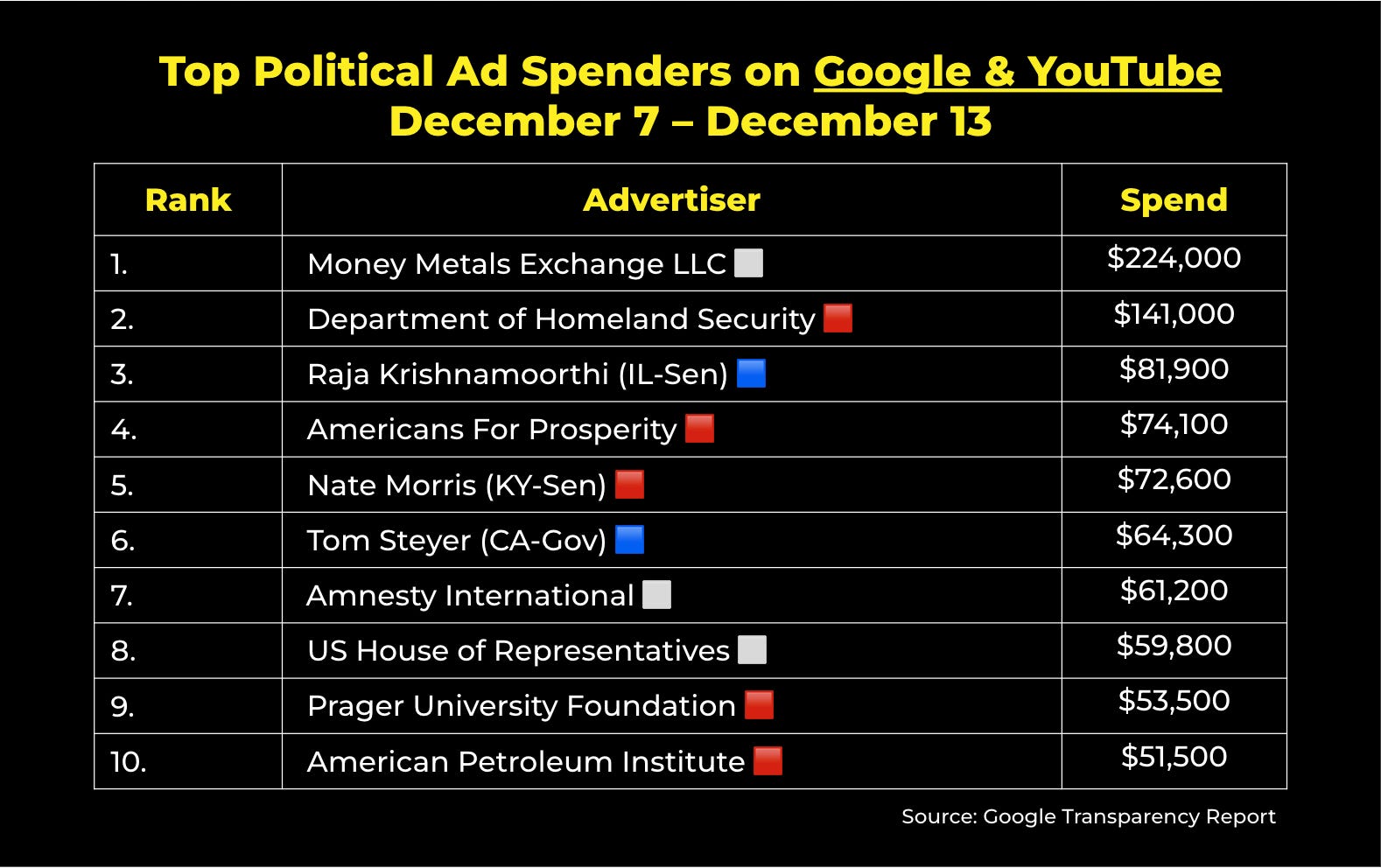 Meanwhile, political advertisers spent nearly $2.2 million on Google and YouTube ads last week. These were the top ten spenders nationwide: