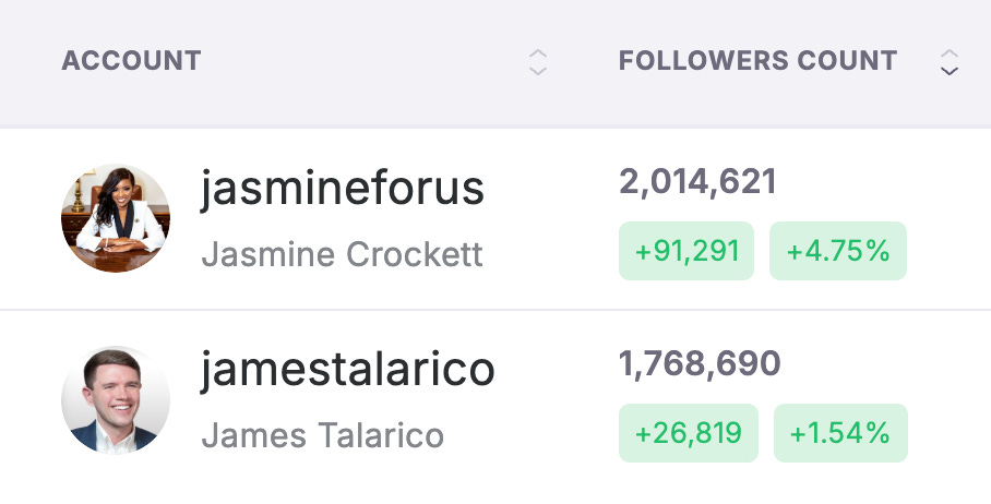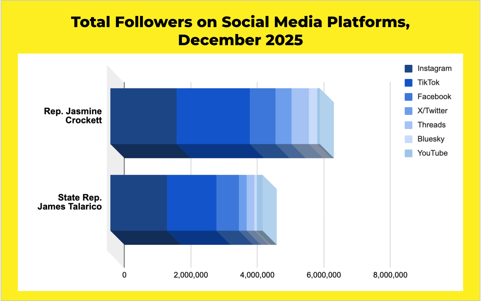 As of Wednesday (12/17), Rep. Crockett had a combined total of 6,293,600 followers across these platforms, and State Rep. Talarico had 4,589,900. TikTok and Instagram were the largest platforms for both, with Crockett clocking in at 2 million on Instagram and 2.2 million on TikTok, and Talarico at 1.7 million on Instagram and 1.5 million on TikTok. These are obviously incredibly strong numbers for each, with Crockett slightly beating out Talarico (with regard to followers) on each platform – interestingly, with the exception of YouTube, where Talarico has 187,000 subscribers to Crockett’s 75,700.