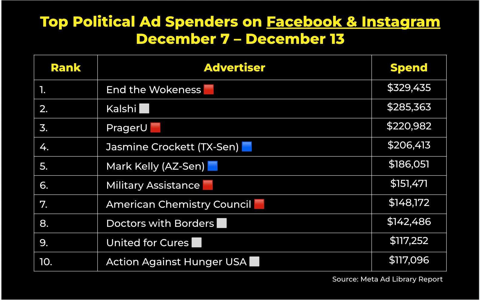 FWIW, U.S. political advertisers spent about $11.6 million on Facebook and Instagram ads last week. Here were the top ten spenders nationwide: