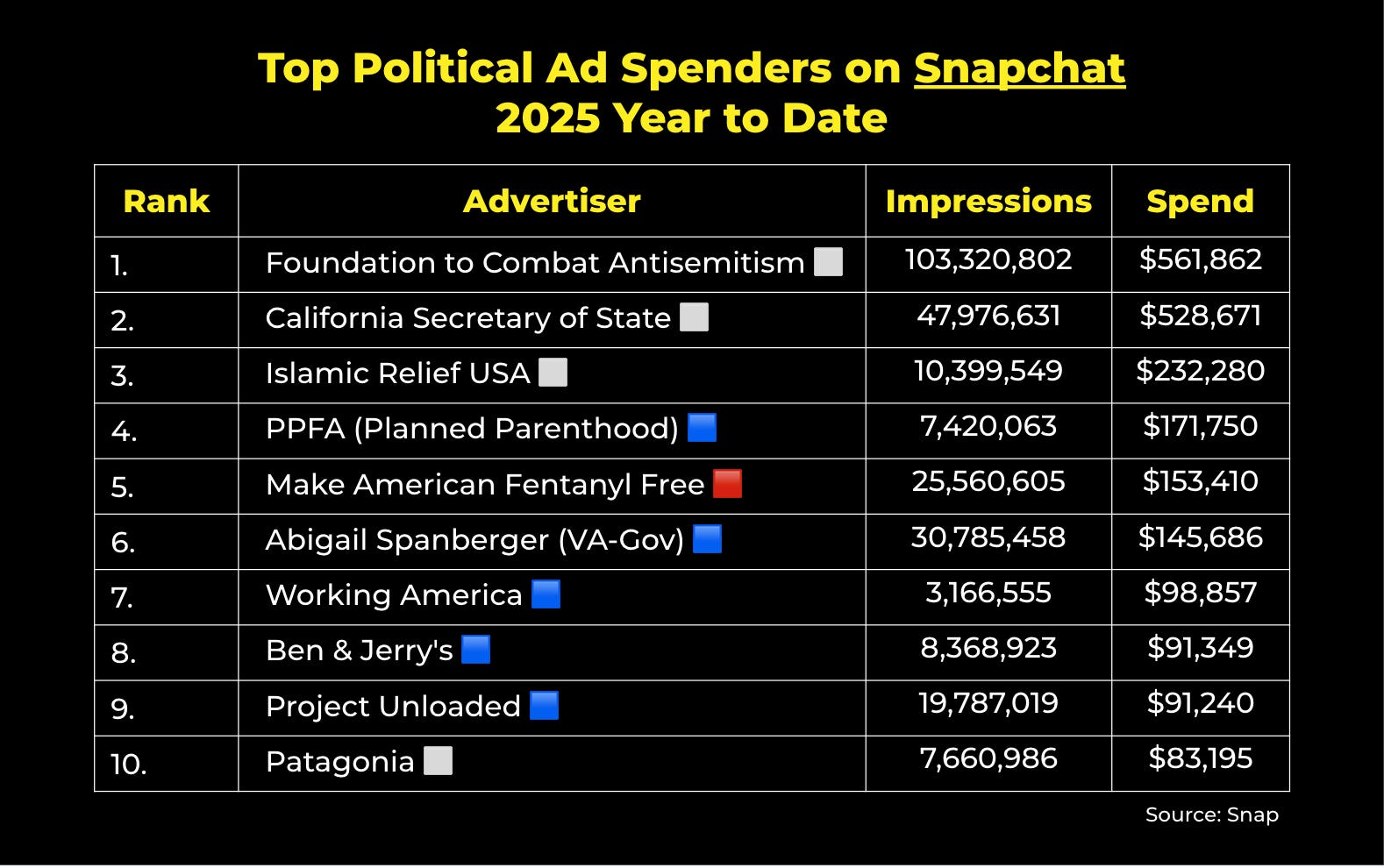 …and lastly, on Snapchat, political advertisers in the U.S. have spent around $3.4 million on ads in 2025. Here are the top spenders year to date:
