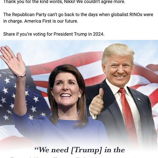 Her team chose not to run Facebook fundraising ads featuring rally clips or her launch video - which seems like a major mistake. The only fundraising ads on Facebook in support of Haley’s bid appeared yesterday morning - 48 hours after her official launch.