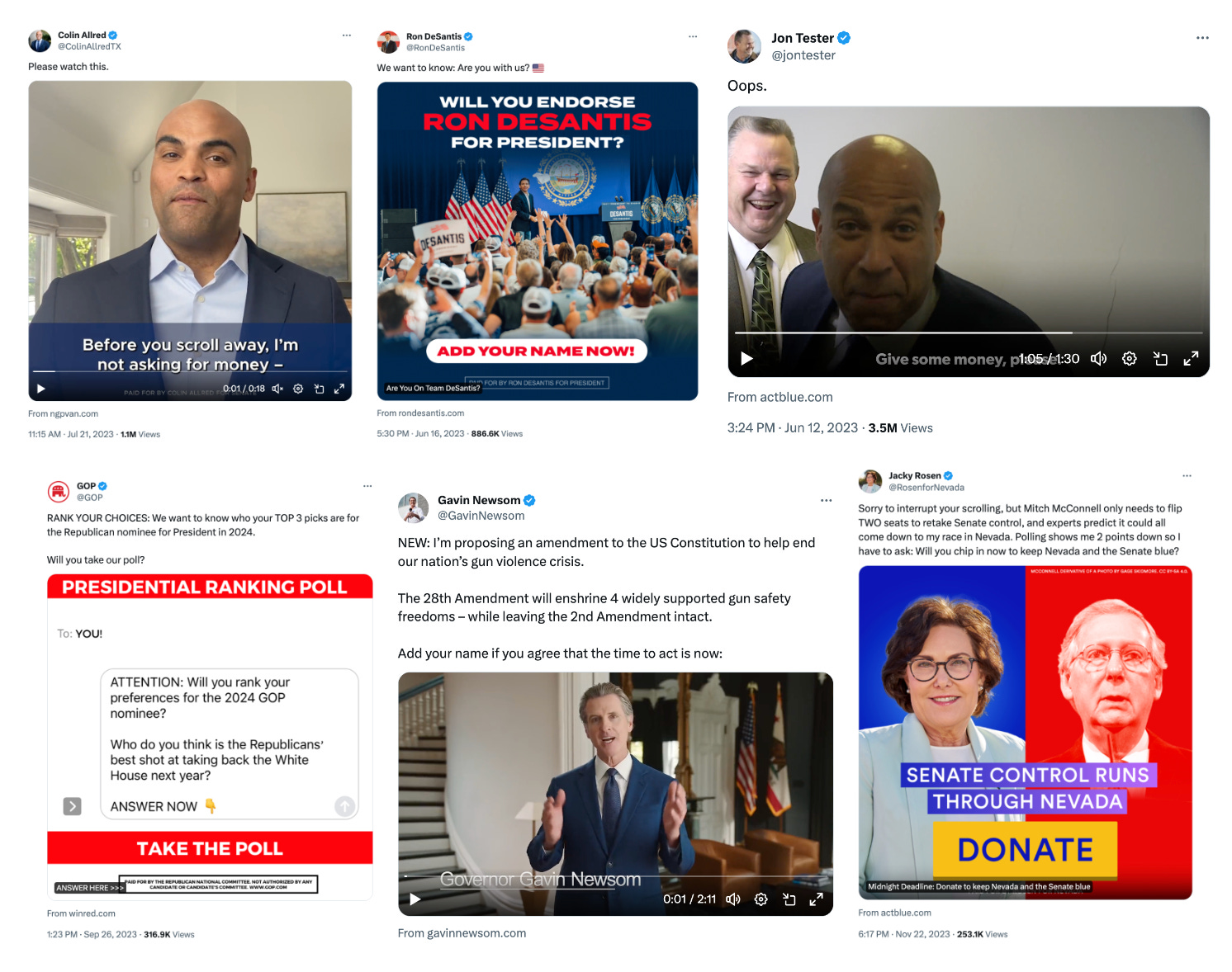 The top-spending Democratic campaigns on the platform last year were Jon Tester, Ruben Gallego, Gavin Newsom, Colin Allred, and Adam Schiff. Among Republicans, it was Ron DeSantis, Perry Johnson, Vivek Ramaswamy, Francis Suarez, and Tim Scott.